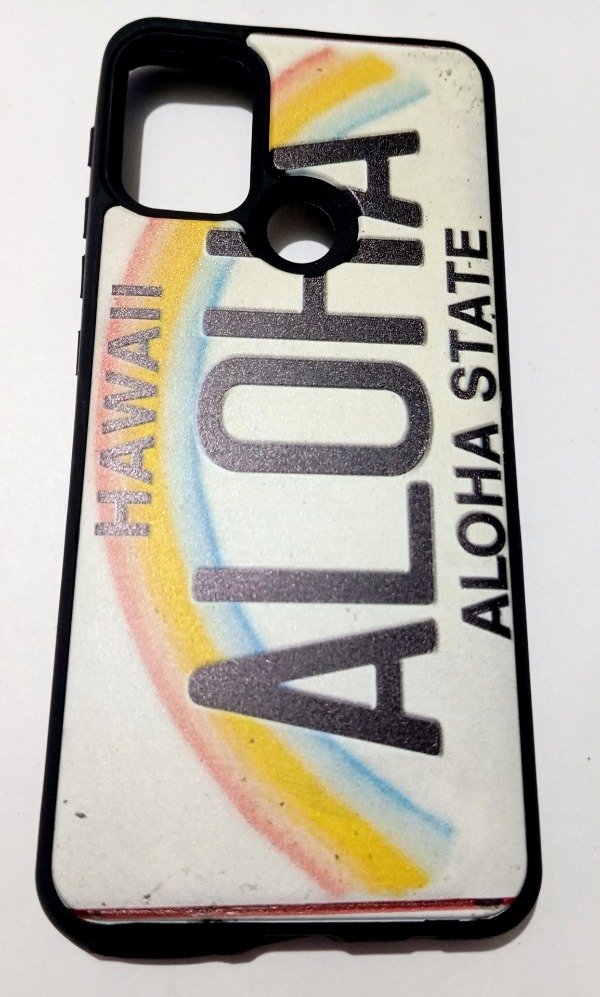Diseño tipo patente con la inscripción "ALOHA STATE – HAWAII", sobre fondo claro con detalles de arco iris pastel. El material es rígido y resistente, con bordes de goma negra que aportan protección reforzada contra golpes y caídas. Incluye recorte para lector de huellas y módulo de cámara compatible con los modelos Motorola G10, G20 y G30. Estilo llamativo y veraniego.