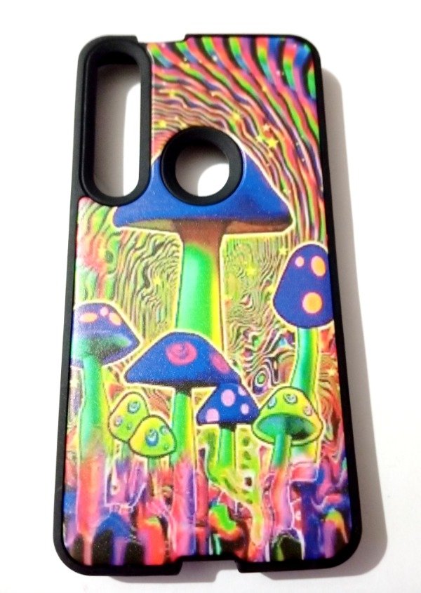 🌈 Diseño: Ilustración psicodélica con hongos fluorescentes en tonos verdes, violetas, rosas y azules, sobre un fondo con ondas multicolor y efecto visual distorsionado.