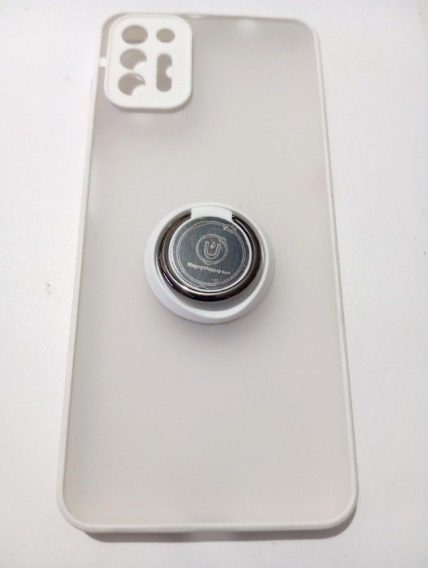 Moderna y funcional. Funda con bordes blancos y parte trasera translúcida, ideal para quienes buscan un estilo simple pero con un toque diferente. Incluye anillo metálico giratorio para mejor agarre y comodidad.