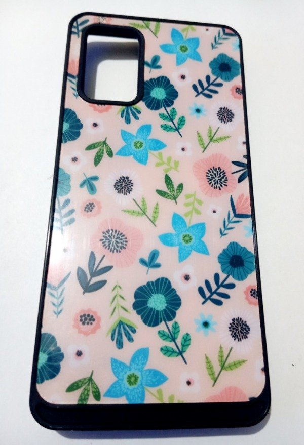 Funda rígida compatible con Samsung Galaxy A03s, con diseño floral sobre fondo rosado. Su estética combina flores en tonos azul, verde y coral, aportando un estilo delicado y moderno.