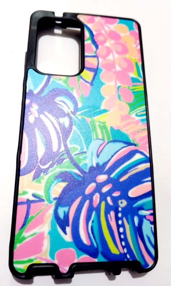 Dale un estilo único a tu Samsung A52 con esta funda estampada de diseño tropical vibrante. Con hojas en tonos azul, amarillo y verde, y flores rosadas sobre un fondo celeste, esta funda le da un toque alegre, veraniego y original a tu celular.